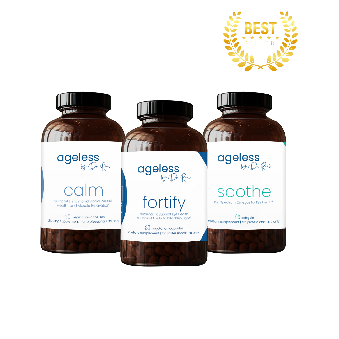 Make your eyes sparkle with Dr. Rani's Ageless Eyes Bundle. These three supplements work together to help you turn back the clock and get healthy eyes from the inside out. Protect and preserve your eyesight to help keep them healthy and strong for years to come.