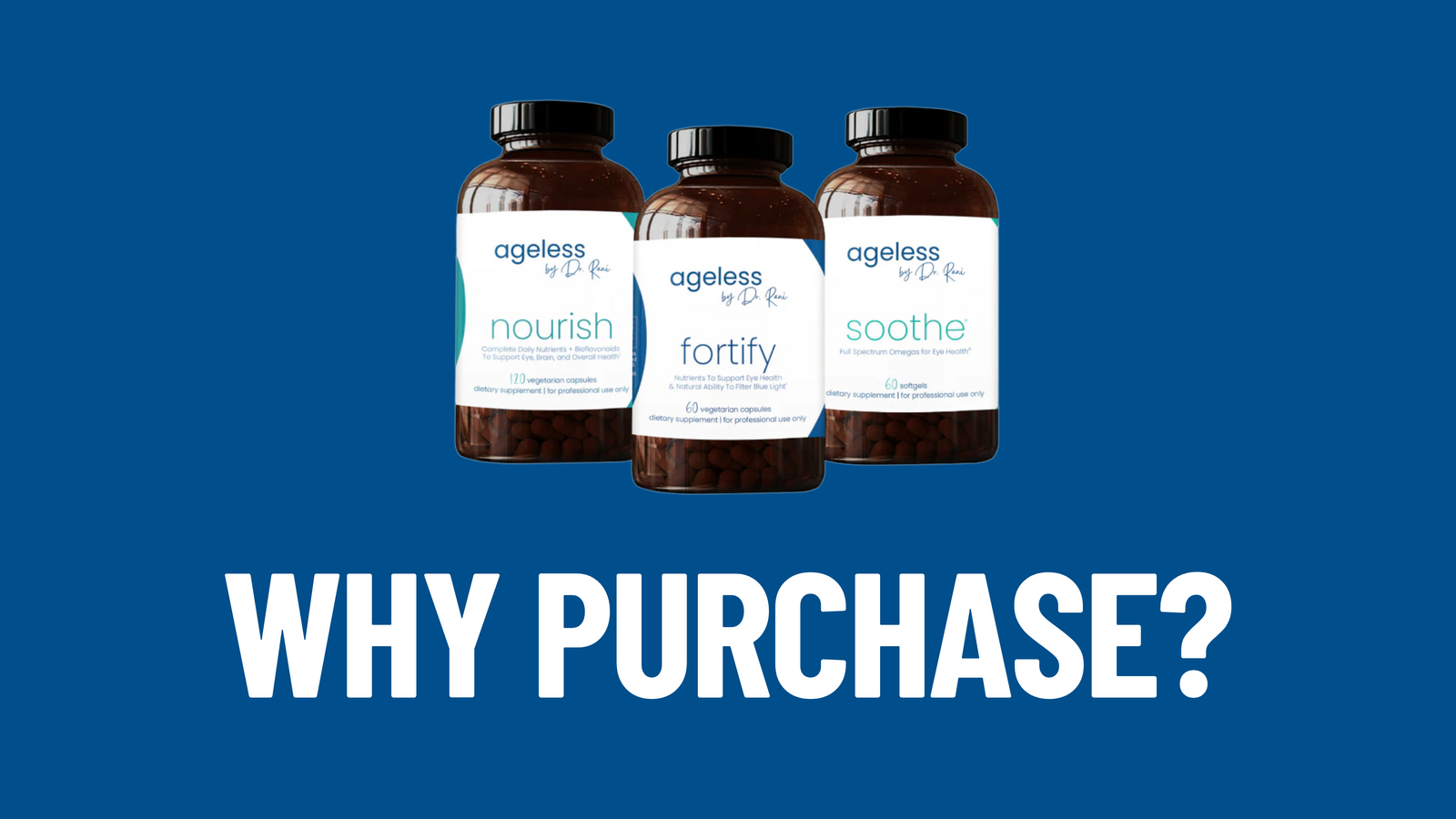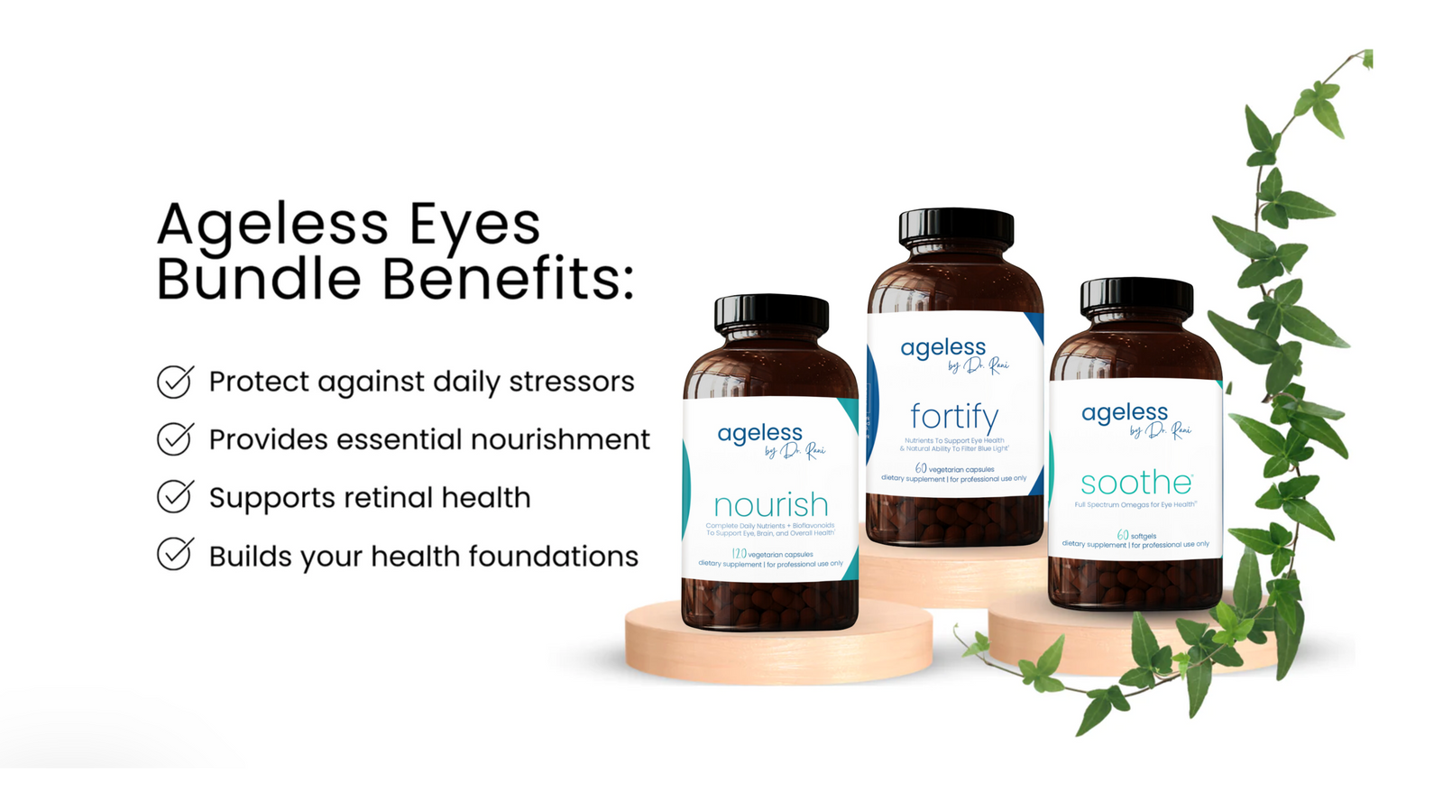 The Ageless Eyes Bundle contains 3 foundational supplements that offer the COMPLETE nutrient support you require for healthy vision and the prevention of common eye disorders.